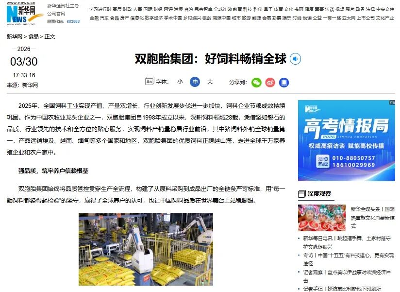编者按:近日,新华网聚焦双胞胎集团28年深耕饲料领域的发展成果,推出《双胞胎集团:好饲料畅销全球》专题报道,从品质、技术、服务三大核心维度,展现其作为农业产业化国家重点龙头企业的全球竞争力。